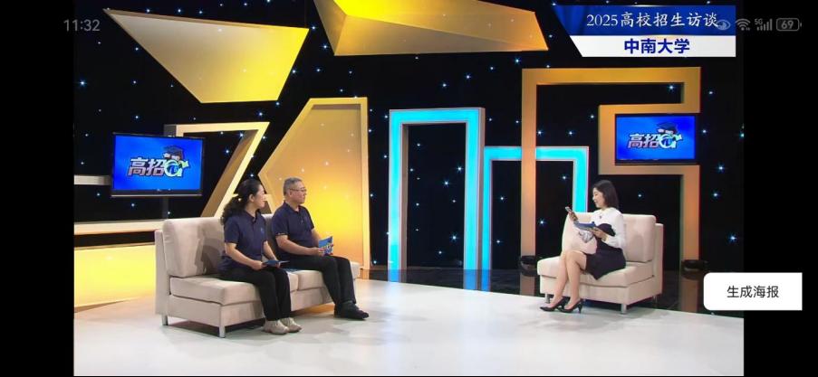 图为天津招生组尹逊强、杨丽娜两位老师在天视教育频道《高招er》直播现场