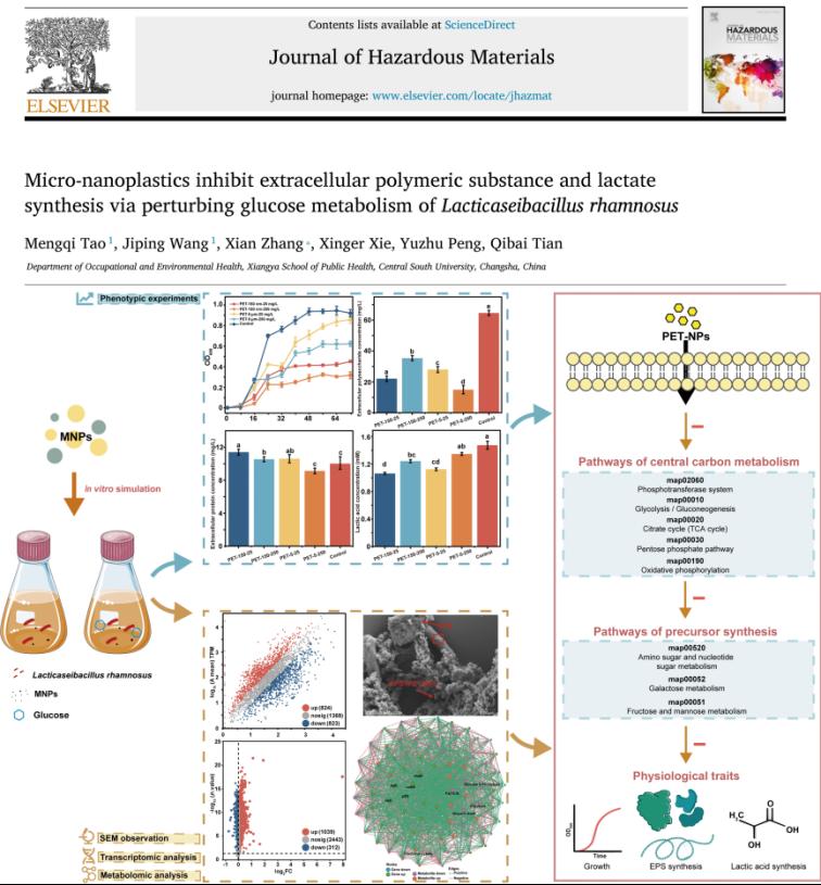 团队通过体外消化模拟与多组学联合技术,揭示经模拟消化的微纳塑料(尤其150 nm PET)通过抑制中心碳代谢通路中关键基因(galK、bglA等)与代谢物水平,阻断Lacticaseibacillus rhamnosus的葡萄糖代谢-产物合成轴,从代谢调控层面阐明胞外多聚物与乳酸合成受阻的分子机制。这一重要发现为评估微纳塑料对肠道益生菌的功能性损伤提供了理论依据,也为塑料污染物健康风险研究提供了新视角(J Hazard Mater,研究生陶梦琦、王吉萍为共同第一作者,张宪为通讯作者)。