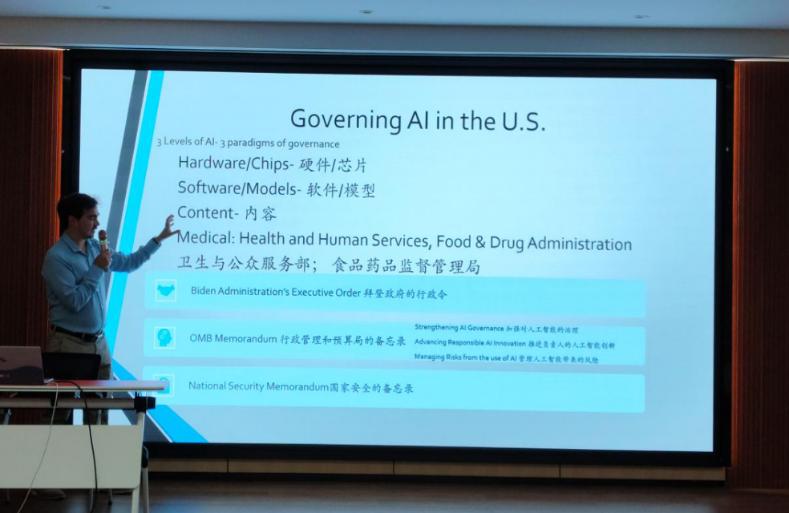 Lucero教授开展了主题为“美国人工智能法律政策进展及医疗健康领域应用”的报告,他用熟练的汉语、生动的语言为大家介绍了美国人工智能在医疗领域的立法现状、学术担忧和国际对话机会。汇报后,与会老师们踊跃提问,与Lucero教授展开了热烈的探讨。胡国清经理以自动驾驶事故等事件的责任归属为题,与Lucero教授展开了对新兴领域立法态度的探讨。