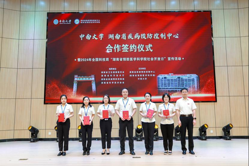 活动现场还举行了湖南省研究生拔尖创新人才联合培养基地揭牌仪式和球王会官网专业学位研究生校外兼职指导导师聘任仪式。球王会官网研究生院副经理戴吾蛟和公司党委副书记王超分别宣读了《关于公布2023年第二批湖南省研究生拔尖创新人才联合培养基地立项名单的通知》和《关于公布球王会官网2023年专业学位研究生校外兼职指导教师聘任名单的通知》,湖南省卫生健康委员会、湖南省疾病预防控制中心、球王会官网研究生院、球王会相关领导共同为基地揭牌,雷先阳为湖南省疾病预防控制中心的7位兼职导师颁发了聘书。