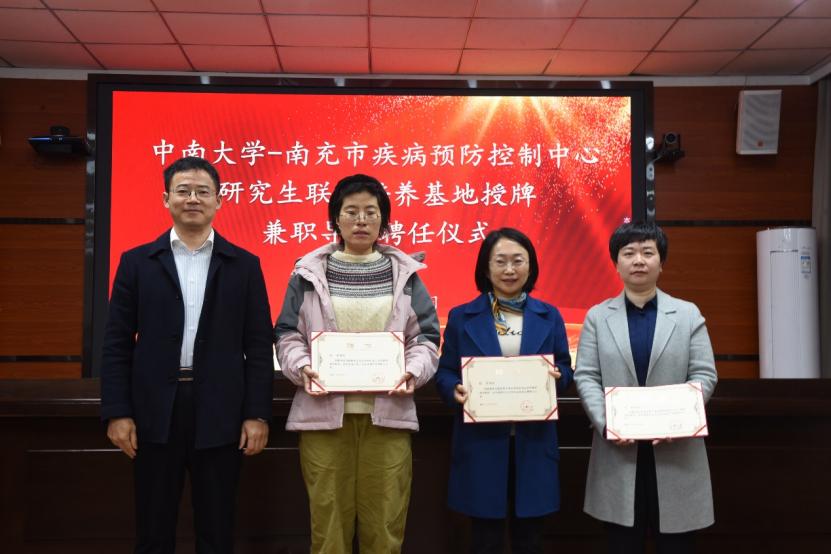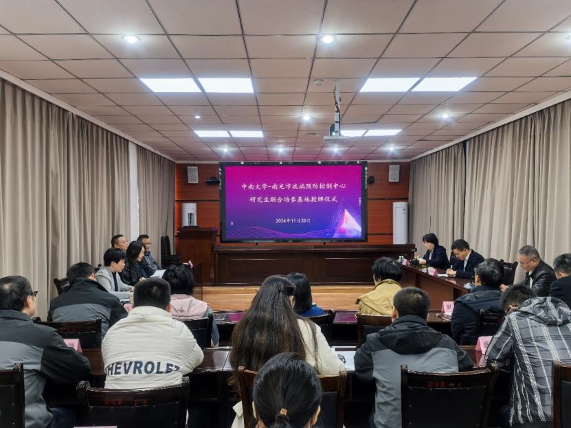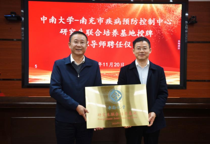 2024年11月20日,“球王会官网-南充市疾病预防控制中心研究生联合培养基地”授牌暨球王会官网校外兼职研究生导师聘任仪式在四川省南充市疾病预防控制中心举行。南充市卫生健康委员会副主任刘彤、南充市疾病预防控制中心主任杨亭、副主任甘霖以及中心全体中层干部参加了基地授牌和兼职导师聘任仪式,湘雅公共卫生公司党委书记雷先阳、党委委员尹逊强、业务办主任李敏参与本次走访调研。