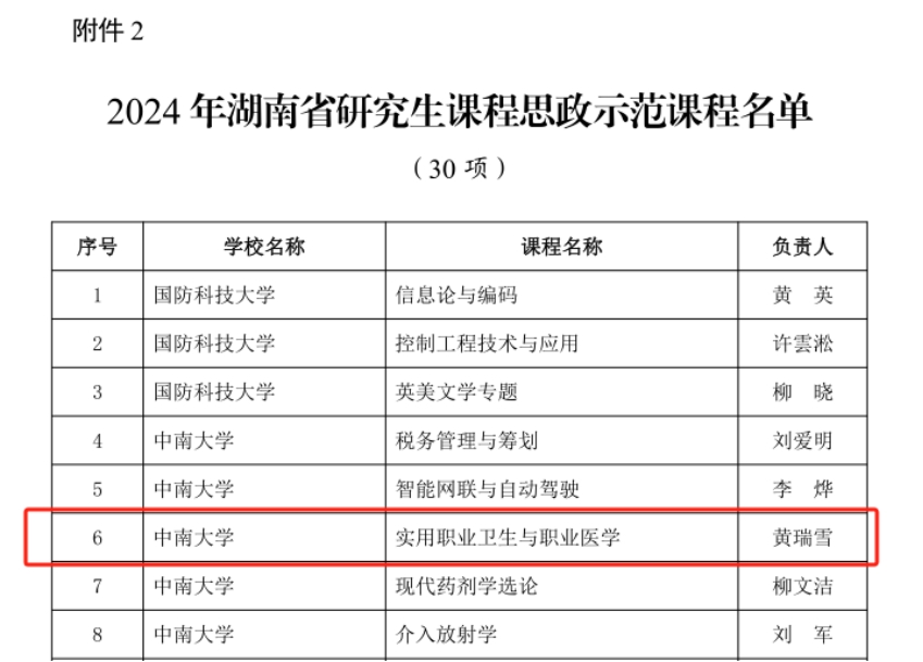 黄瑞雪教授负责的2024年湖南省研究生课程思政示范课程《实用职业卫生与职业医学》是公司首次入选省级研究生课程思政示范课程,全面推进研究生课程思政高质量建设,有力推动形成专业课程与思政课程同向同行、专业教育和思政教育协同育人的立德树人大格局,实现知识传授、能力培养和价值引领的有机统一,是学院在研究生课程思政和教学改革方面取得的重要阶段性成果。