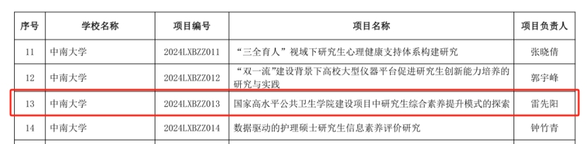 雷先阳书记的教改项目《国家高水平公共卫生学院建设项目中研究生综合素养提升模式的探索》,以球王会为试点,立足国家高水平公共卫生学院建设,针对公共卫生硕士培养形式单一化、培养能力有短板的痛点问题,提出探索形成“以理论为支持、以员工为中心、以用人单位为导向”的研究生综合素养提升模式。本研究将描述高校公共卫生专业研究生综合素养现况,从研究的角度来定义研究生综合素养应该包含的内容,构建以 OBE 理论为导向的研究生综合素养提升新模式,并通过开展试点调研评价新模式。