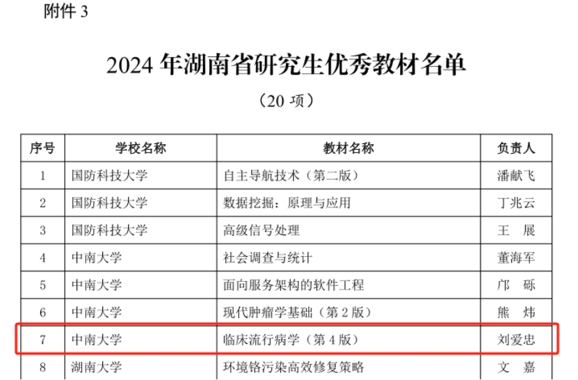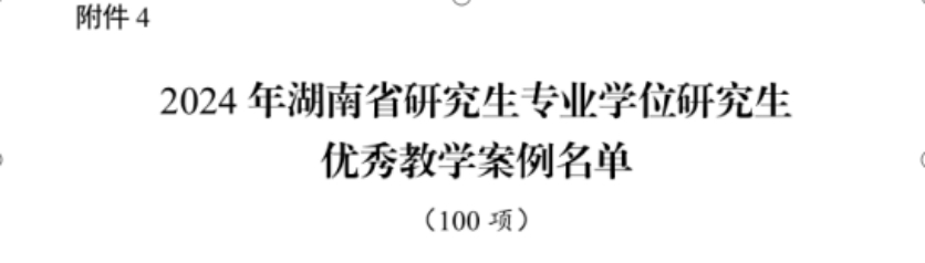 2024年12月31日,湖南省教育厅印发了《湖南省教育厅关于公布 2024年湖南省研究生精品示范课程、教学改革等项目立项名单的通知》(湘教通〔2024〕274号)文件,公布了2024年湖南省研究生精品示范课程、课程思政示范课程、研究生优秀教材、专业学位研究生优秀教学案例、学位与研究生教学改革研究立项不资助项目、研究生科研创新立项不资助项目的评审结果。公司党委书记雷先阳获湖南省学位与研究生教学改革研究项目1项、黄瑞雪教授获湖南省课程思政示范课程1项、李广迪教授获湖南省专业学位研究生优秀教学案例1项、刘爱忠教授获湖南省研究生优秀教材1项。