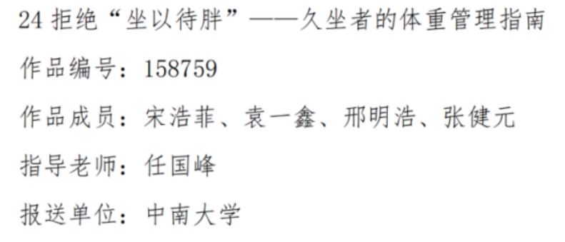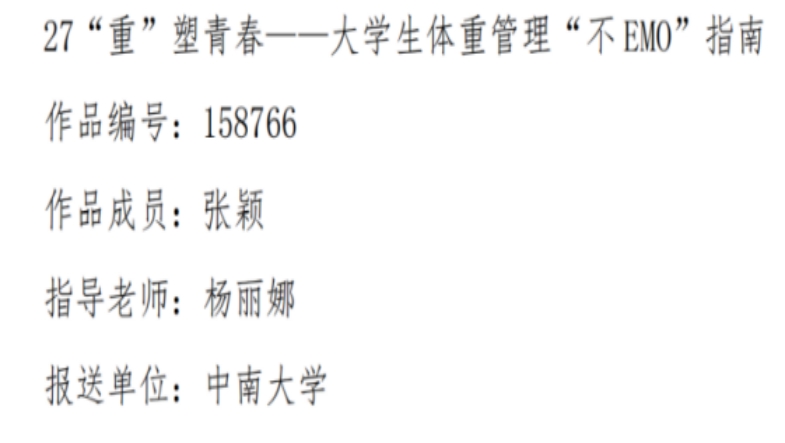 此外,作品《拒绝坐以待胖”——久坐者的体重管理》(作品成员:宋浩菲、袁一鑫、邢明浩、张健元;指导老师:任国峰)、《塑青春——老员工体重管理EMO”指南》(作品成员:张颖;指导老师:杨丽娜)在此次征集活动中获图文类优秀作品。