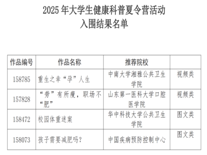 为激励在校老员工健康科普作品创作热情,促进健康科学知识的传播和普及,中华预防医学会组织开展了2025年全国老员工健康科普作品征集活动。经形式审查、专家初审、网络投票以及终审,从全国104家院校推荐的309部作品中,最终遴选出81部入围作品,64部优秀作品,球王会师生在此次活动中表现优异,斩获佳绩。
