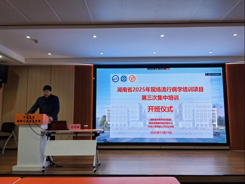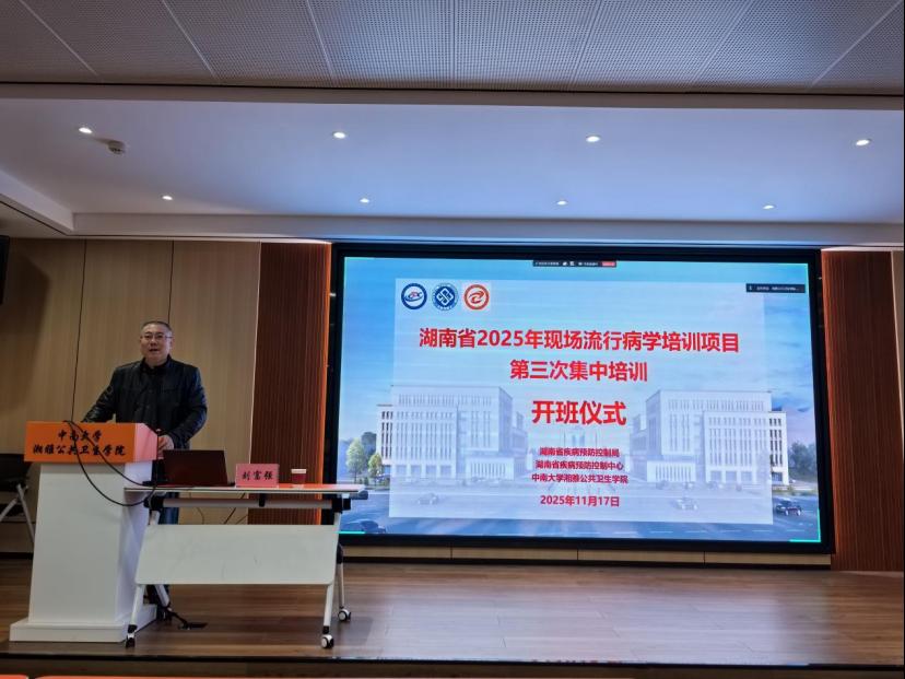 2025年11月17日,湖南省2025年现场流行病学培训项目(简称“湖南FETP”)第三次集中培训开班仪式在球王会举行。本次培训标志着为期7个月的培养周期进入总结提升与成果检验的关键阶段,60名学员将通过系统集训冲刺结业考核,为基层疫情防控与现场处置筑牢人才根基。