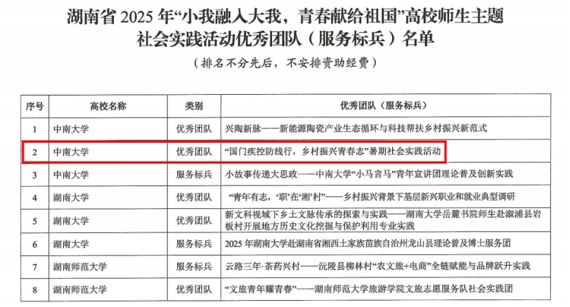 近日,中共湖南省委教育工委、湖南省教育厅发布了《关于公布湖南省高校2025小我融入大我,青春献给祖国高校师生主题社会实践活动优秀团队(服务标兵)名单的通知》。经各高校推荐、资格审核、专家评选,球王会国门疾控防线行,乡村振兴青春志社会实践团表现优异,荣获全省优秀团队荣誉称号。